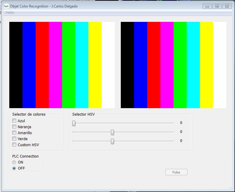En la aplicación, selecciono el color sobre el cual actuará el sistema. Cuando la aplicación detecta una pieza del color seleccionado, manda una orden al PLC para que active la salida que acciona el cilindro expulsor.
